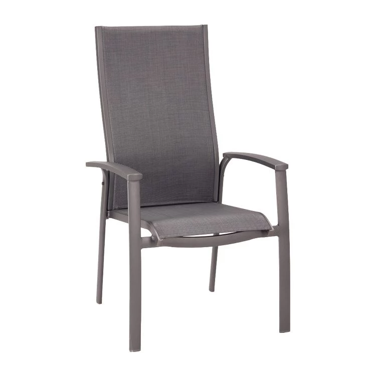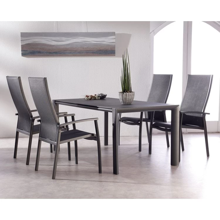 Das Gestell besteht aus pflegeleichtem und wetterfestem Aluminium. Für eine attraktive Optik ist das Gestell im Farbton Anthrazit gehalten. Für die Bespannung der Sitzfläche verlässt sich der Hersteller auf hochwertiges Textilene. Es zeichnet sich durch eine hohe Robustheit gegenüber Hitze und Frost aus und ist leicht zu reinigen. Damit der Stapelsessel optisch ansprechend ist, sind die Sitzfläche und der Bezug im Farbton Grau gehalten.