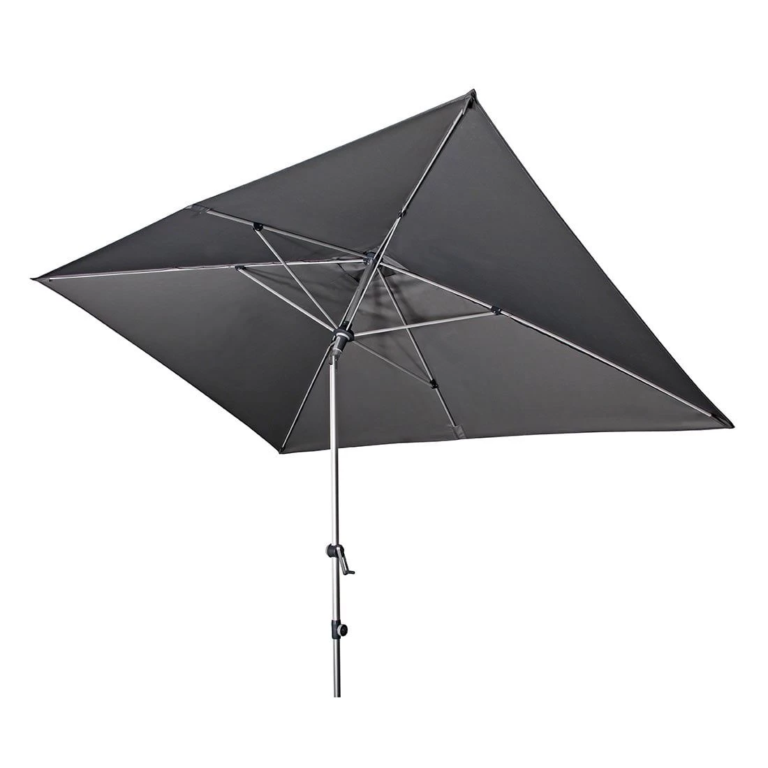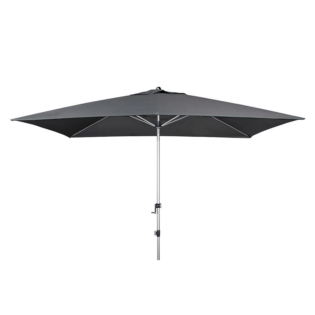 Das Schirmgestell besteht aus leichtem, aber dennoch sehr robustem Aluminium. Massive Streben halten das Schirmdach aus hochwertigem Polyester (UV 80). Der Bezugsstoff ist wasserabweisend, die Bedienung erfolgt mittels einer leichtgängigen Kurbel.