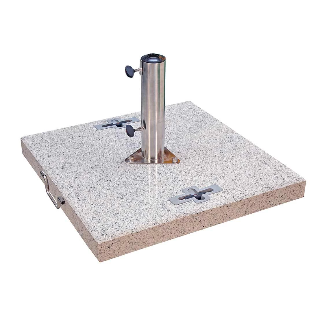 Einfache Handhabung bietet dieser Schirmständer aus Granit. Zwei Rollen sorgen für einfacheren Transport an einen anderen Standort. Zusätzlich sind zwei Tragegriffe am Sockel integriert. Für Schirmstöcke von 32-65 mm. Verwendbar für Mittelstockschirme bis 450cm Durchmesser oder Ampelschirme mit Durchmesser bis max. 350cm rund (oder max. 300x300cm).