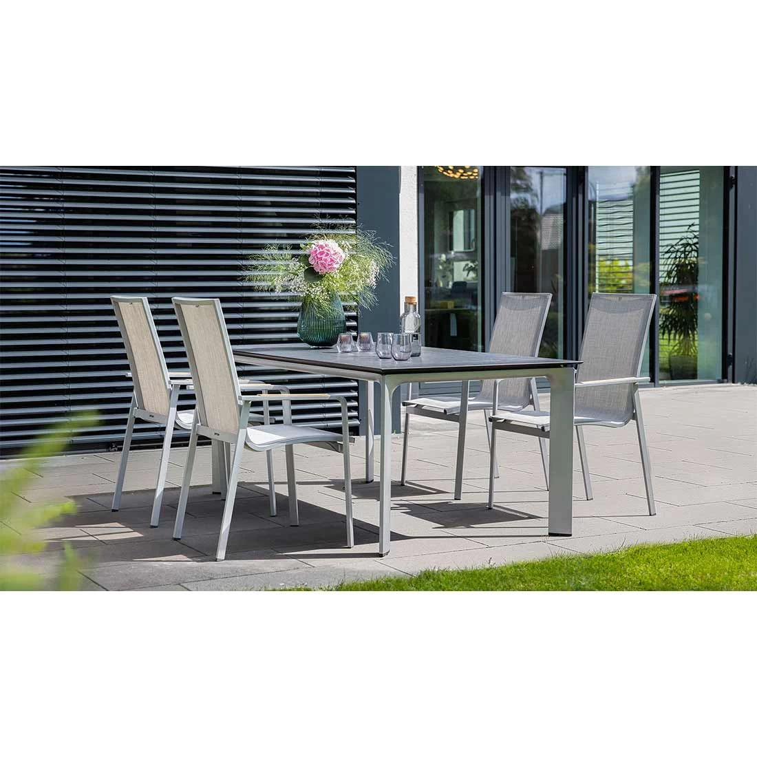 Dank des Gestell-Materials Aluminium zählt das Tischgestell Diamond zu den modernen Tischmodellen, die sich im Garten problemlos aufstellen und bewegen lassen. Farblich ist das Gestell in Silber gehalten.