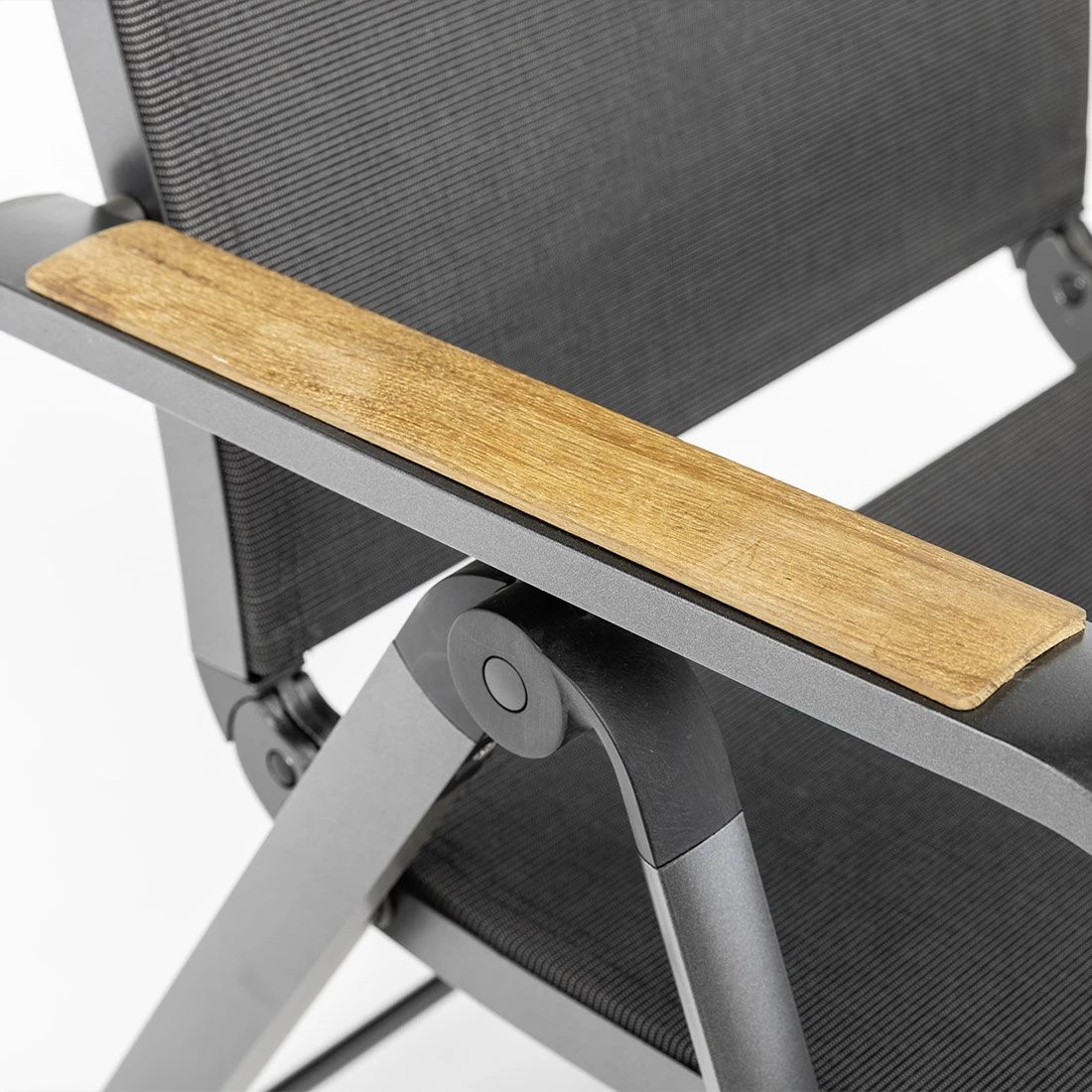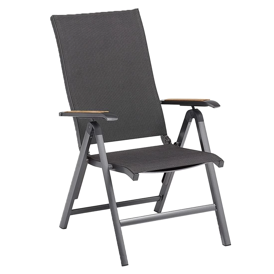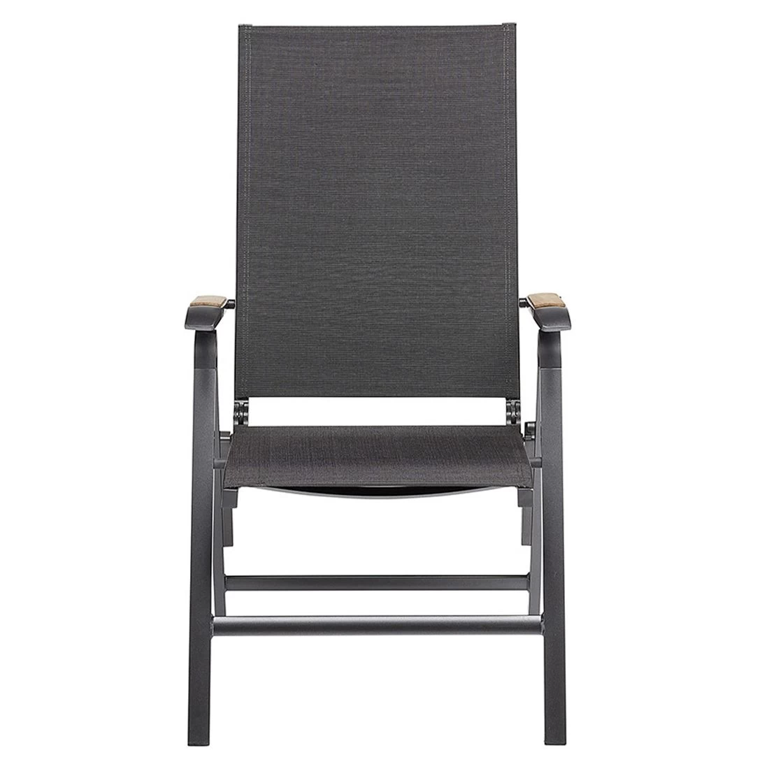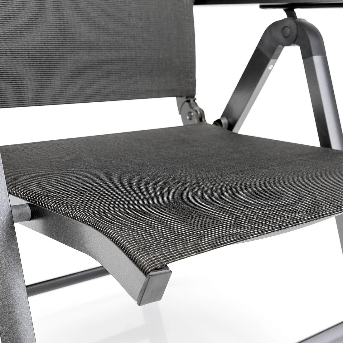 Das Gestell besteht aus pflegeleichtem und wetterfestem Aluminium. Farblich ist dieses in Anthrazit gehalten. Für die Bespannung der Sitzfläche verlässt sich der Hersteller auf hochwertiges Textilene. Es zeichnet sich durch eine hohe Robustheit gegenüber Hitze und Frost aus und ist leicht zu reinigen. Die Sitzfläche ist in ansprechendem Charcoal gehalten.
