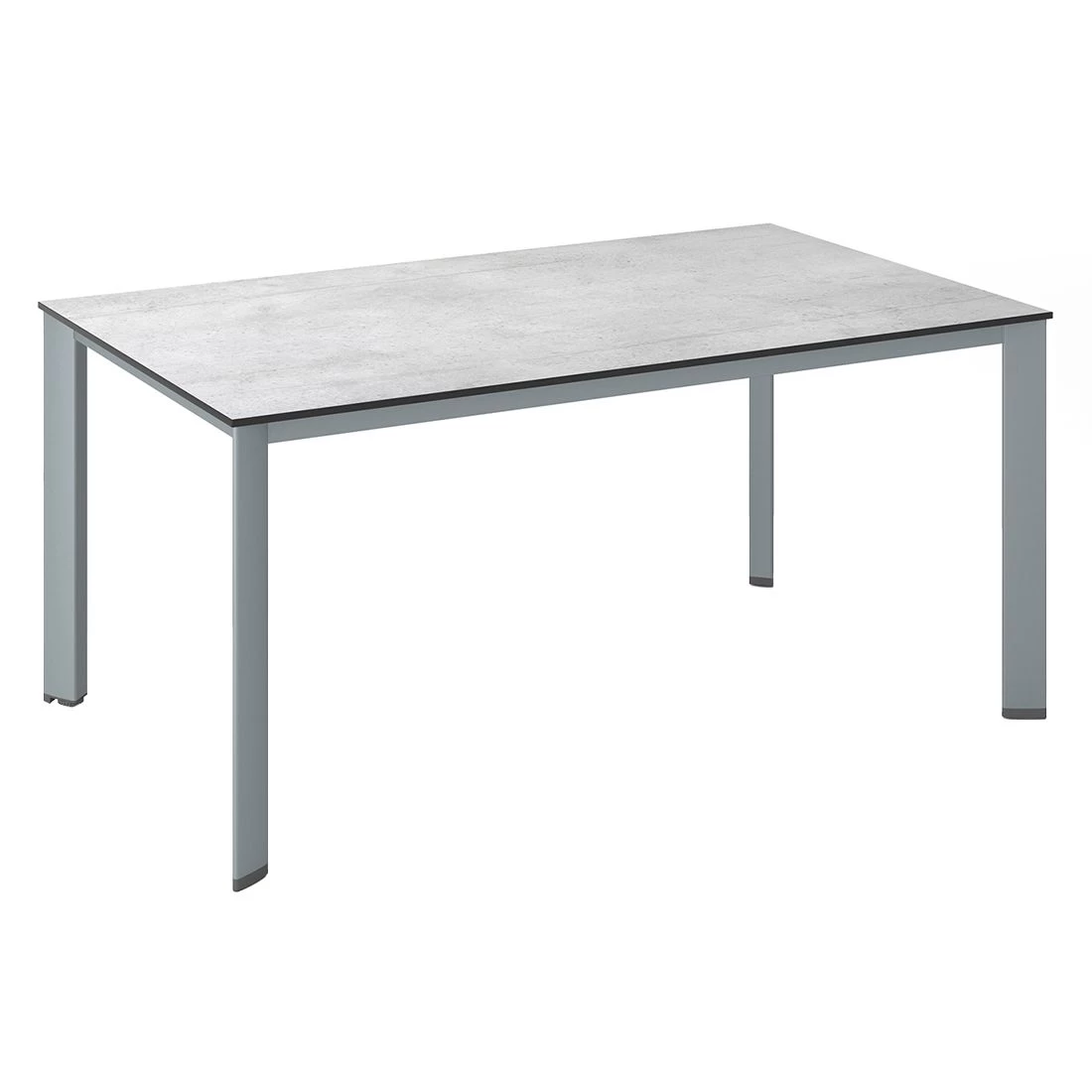 Das Gestell des attraktiven Tisches besteht aus Aluminium. Das klassische Vierfuß-Gestell garantiert Ihnen maximale Beinfreiheit. Eine besonders schöne Optik bietet Ihnen die Tischplatte aus HPL-Kunststoffverbund. Diese im Naturdecor gehaltene Tischplatte ist zusätzlich frostsicher und hitzebeständig bis zu 180 °C. Farblich ist die Tischplatte in einem schönen Grau gehalten. Die Form des Gartentisches ist klassisch rechteckig gestaltet.