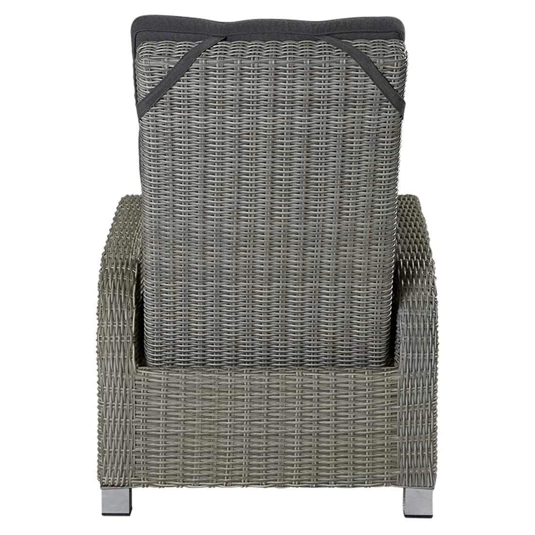Für die Herstellung des Gestells wird hochwertiges und wetterfestes Aluminium verwendet. Die Sitzfläche des Gartensessels besteht aus qualitativ hochwertigem Polyrattan. Ein Material, das sich durch seine lange Haltbarkeit auszeichnet. Die Sitzfläche ist in ansprechendem Grau gehalten. Als hochwertiges Material für den Bezug kommt ein Polyester-Stoff zum Einsatz. Er ist sehr strapazierfähig und bietet somit die idealen Voraussetzungen für den Einsatz im Freien. Farblich begeistert der Bezug in elegantem Dunkelgrau.