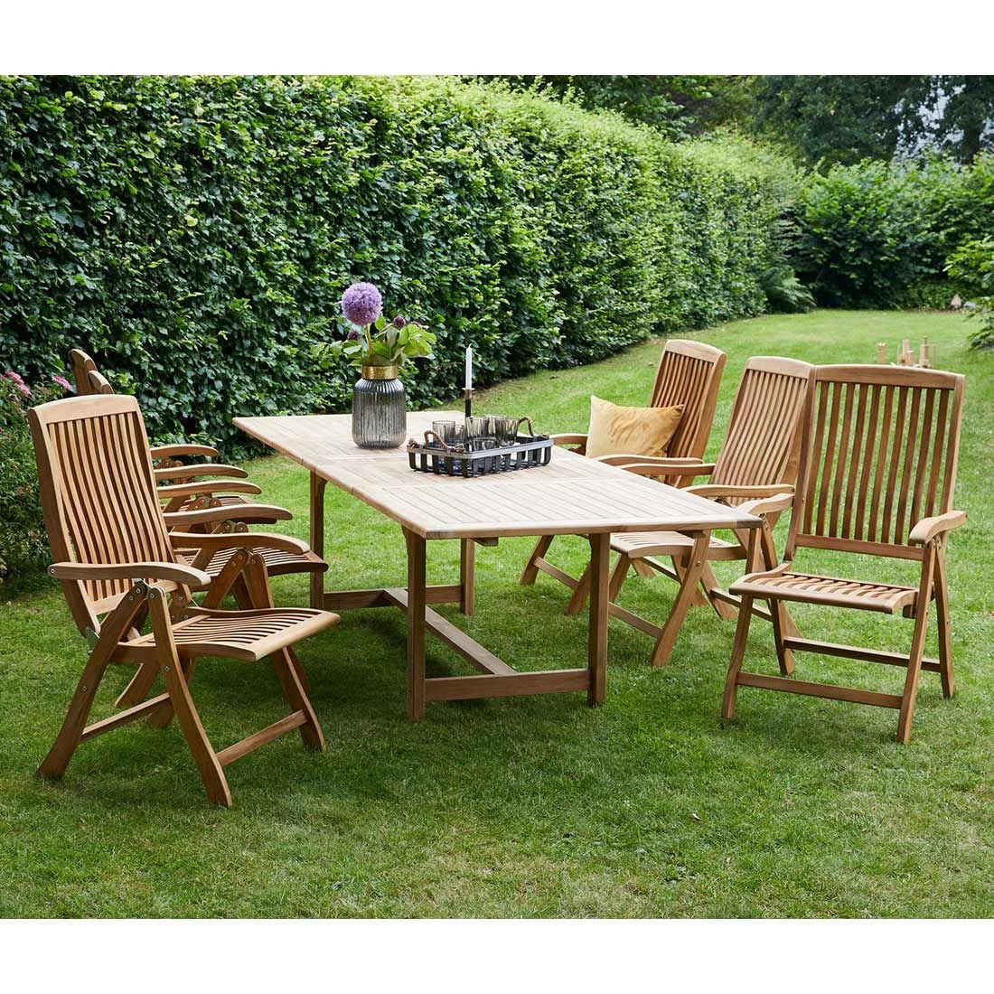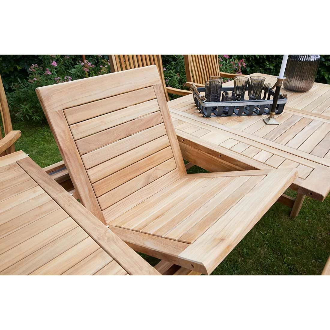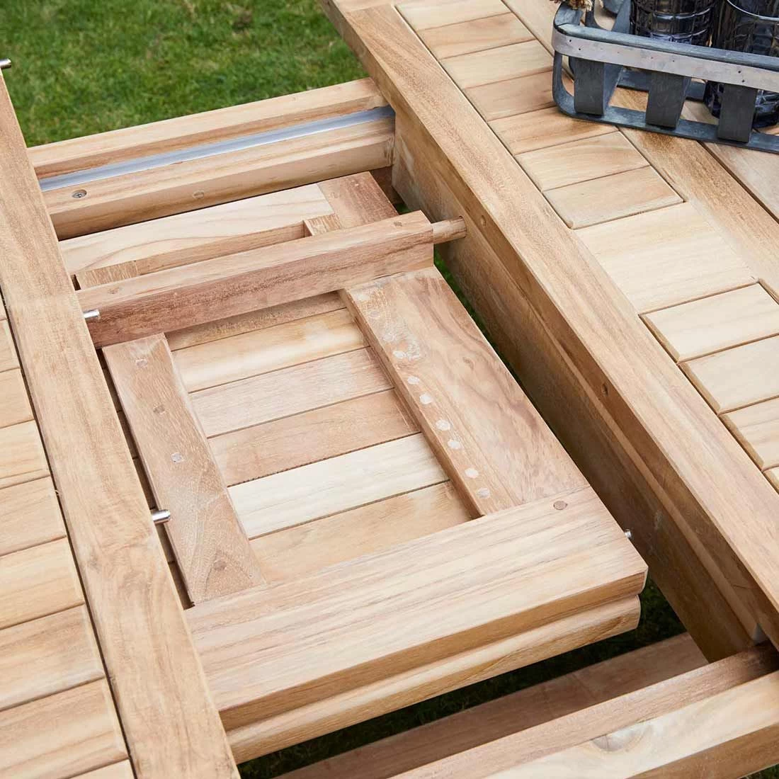 Klassisch aus vier Tischbeinen besteht das Gestell des Tisches. Der Ausziehtisch Riva ist Ton in Ton gehalten: Sowohl das Gestell als auch die Tischplatte sind aus Teakholz gefertigt. Farblich ist die Platte in Natur gehalten. Die rechteckige Form ermöglicht es Ihnen, den Ausziehtisch in Ecken und an Häuserwänden platzsparend einzusetzen.