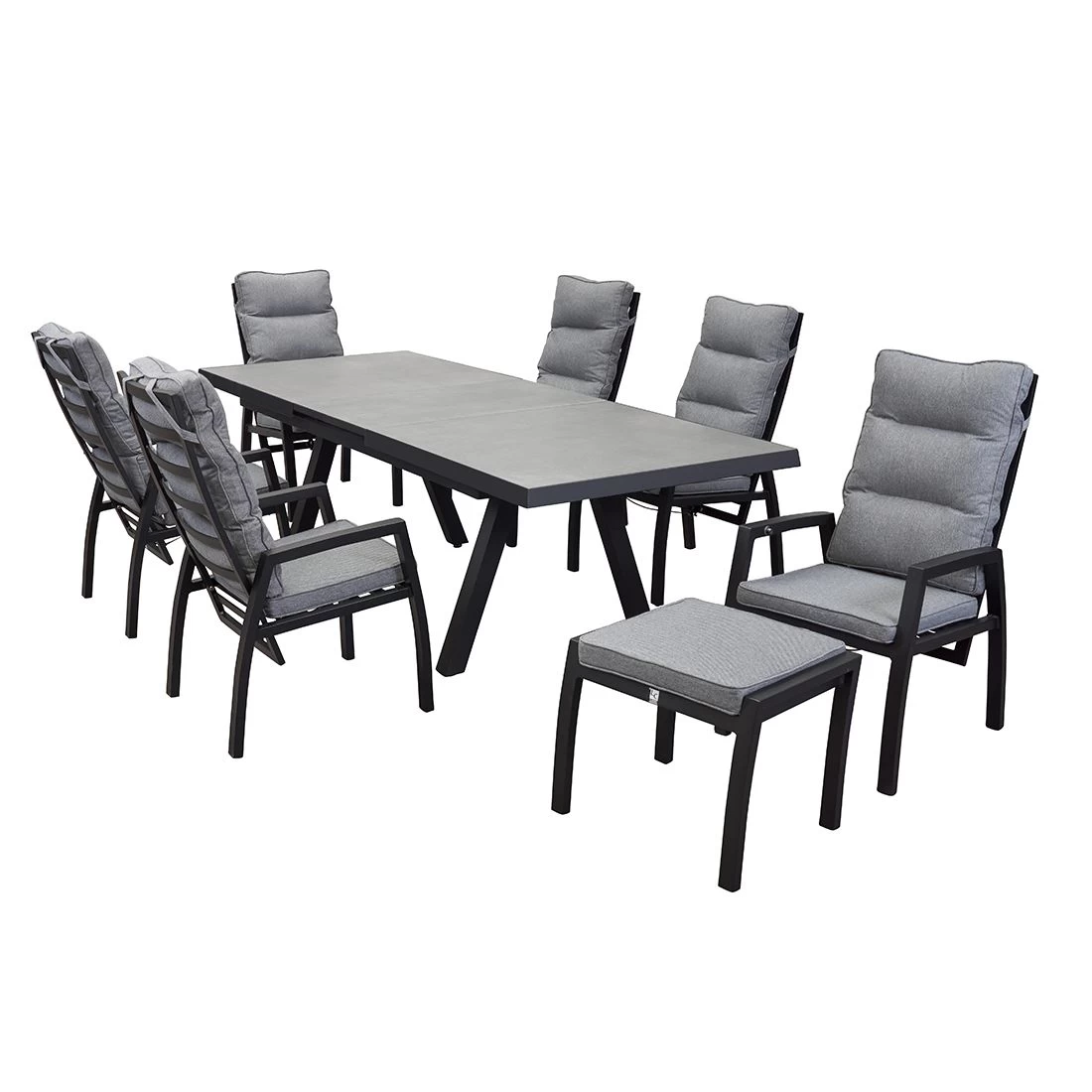 Für die Herstellung des Gestells wird hochwertiges und wetterfestes Aluminium verwendet. Farblich ist dieses in Schwarz gehalten. Das Gestell besticht mit seinen attraktiven Kufen.