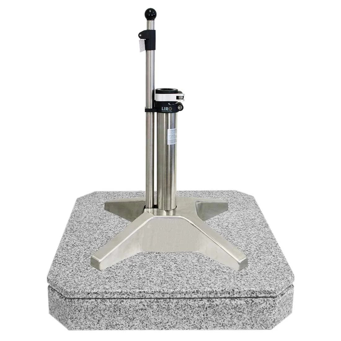 Der Rollensockel lässt sich anhand eines ausziehbaren Bedienhebels, ähnlich einem Wagenheber nach oben heben. Dadurch erhalten die Rollen einen Freilauf. Kleinere Rillen oder Unebenheiten im Boden sind keine Hürde für den LiRo. Im abgesenkten Zustand bietet der Schirmständer durch die große Auflagefläche eine großartige Standfestigkeit.