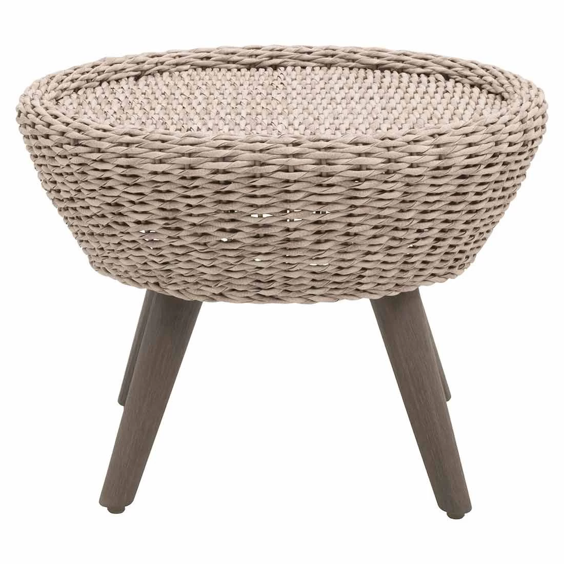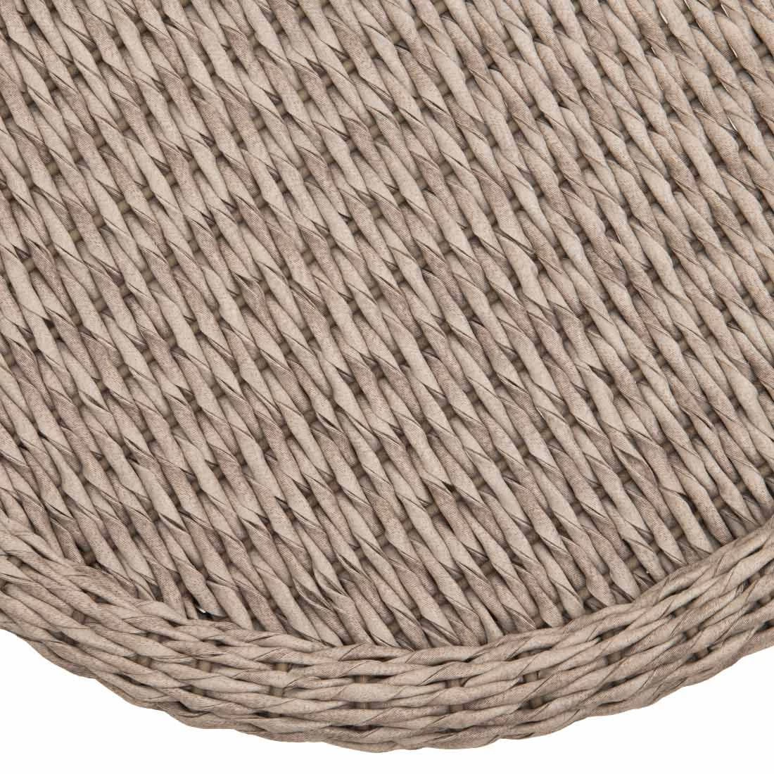Als klassische Design-Komponente fungiert das geradlinige Vierfußgestell. Beim Tischplatten-Material handelt es sich um Polyrattan-Geflecht, weshalb Sie den Beistelltisch Garten optimal im Garten oder auf der Terrasse verwenden können. Farblich ist die Platte in Grau gehalten. Das Design des Beistelltischs ist rund.