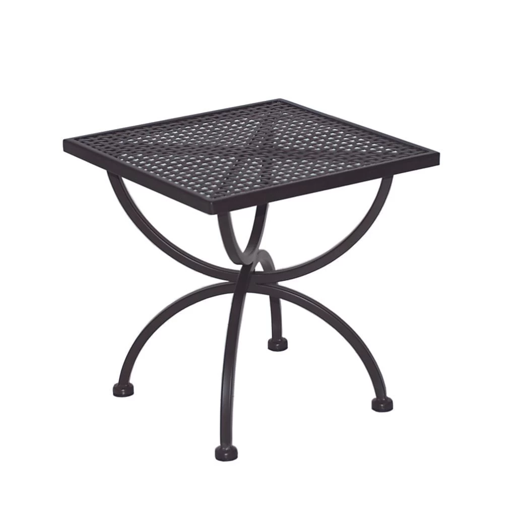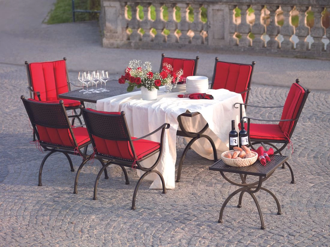 Zum attraktiven Hingucker wird Beistelltisch Garten dank des Gestells aus hochwertigem Schmiedeeisen. Dieses verleiht dem Modell Romeo eine verspielte Optik. Komplettiert wird das Gesamtbild durch das moderne und außergewöhnliche Tischgestell in X-Form (sogenannten Cross Legs). Als Material für die Tischplatte wird hochwertiger und robuster Stahl verwendet. Für eine höhere Widerstandskraft gegen Witterungseinflüsse ist die Platte zusätzlich beschichtet. Farblich ist die Tischplatte in einem schönen Marone gehalten. Mit der rechteckigen Form lässt sich der Beistelltisch platzsparend in Ecken oder an Häuserwänden aufstellen.