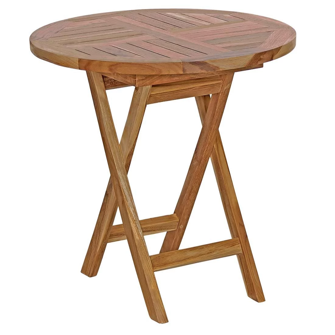 Sowohl die Tischplatte als auch das Gestell sind aus Teakholz gefertigt. Farblich ist die Platte in Natur gehalten. Der Beistelltisch ist in seiner Form klassisch rund gestaltet.