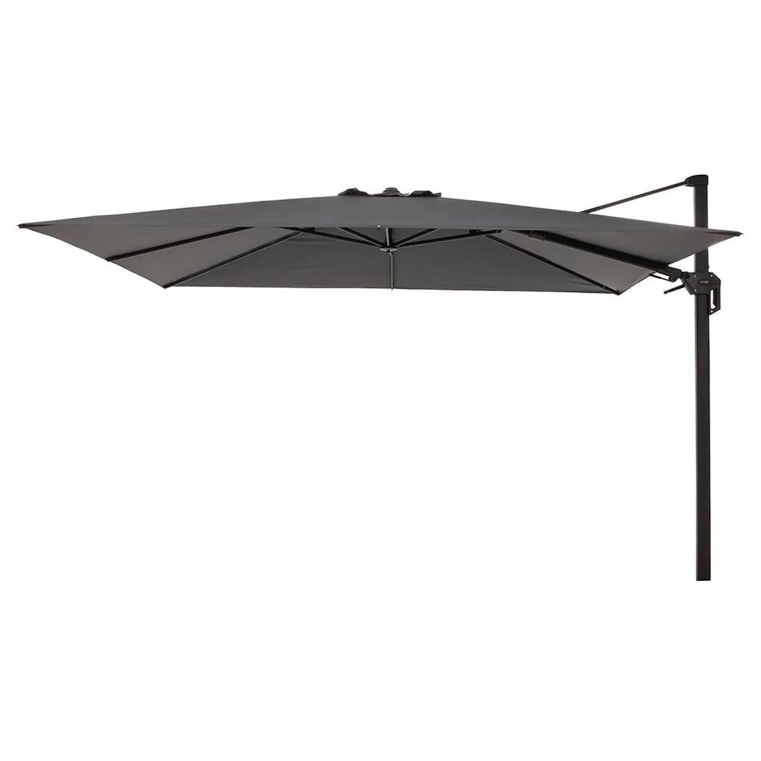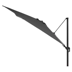 Die lange Seite des Schirmdaches (350 cm) ist nach vorne ausgelegt und bietet somit eine ideale Beschattung für große Tischgruppen. Die Neigung des Schirmdaches ist entlang des Schirmarmes nach rechts oder links möglich.