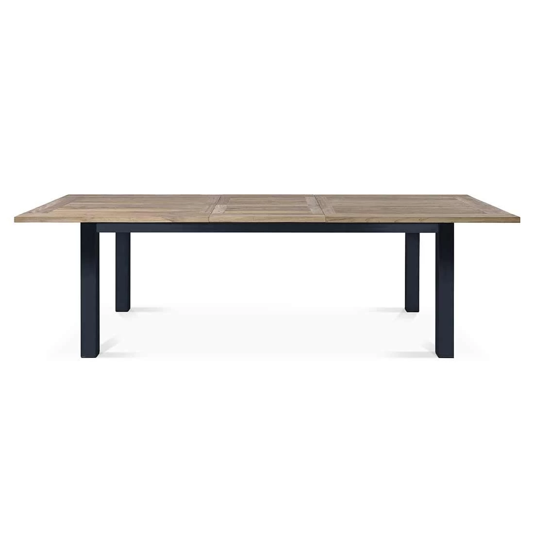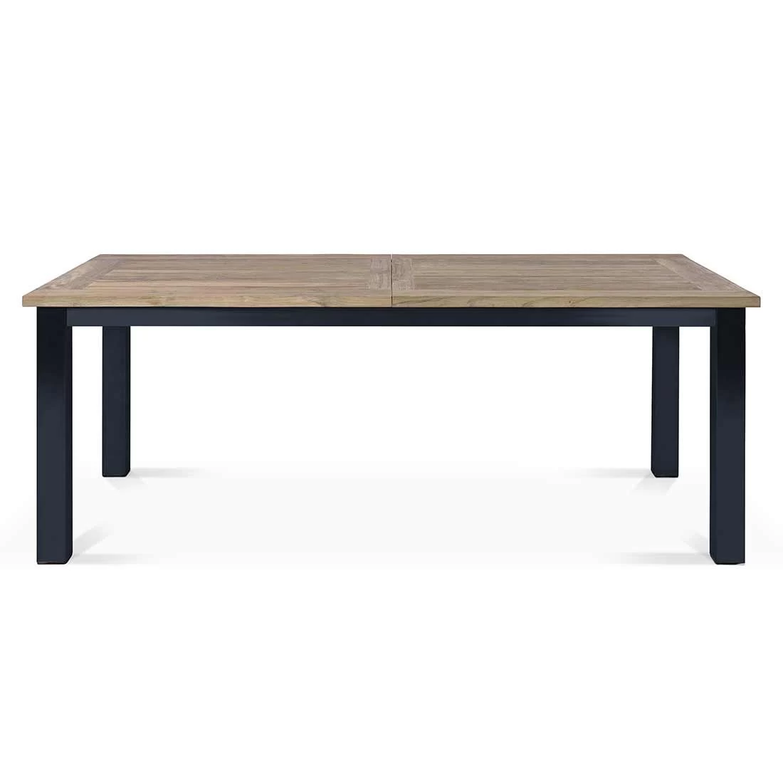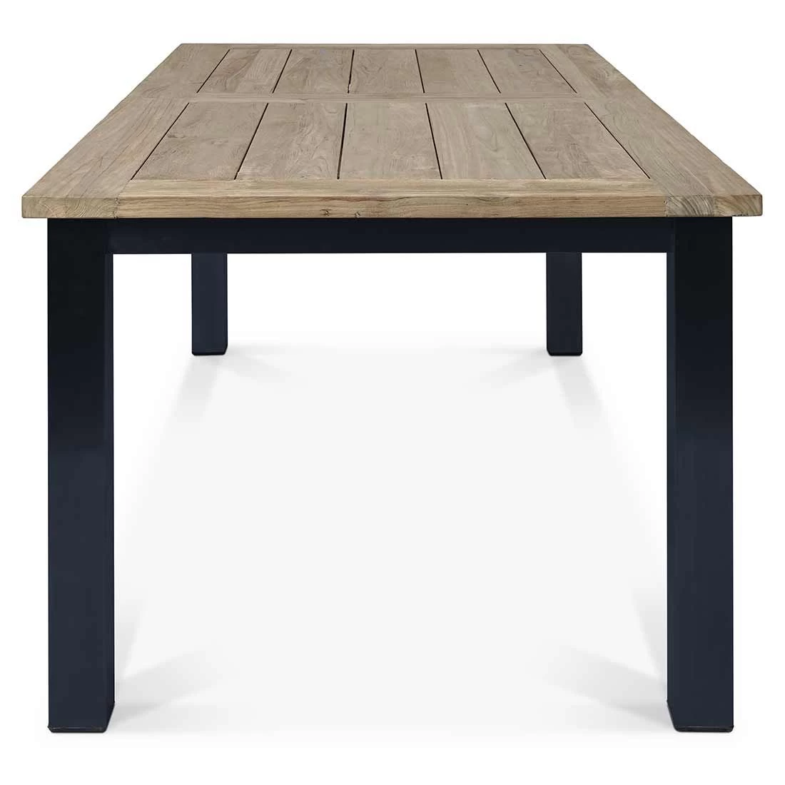 Als Gestellmaterial wird wertiger und rostfreier Edelstahl genutzt. Als klassische Design-Komponente fungiert das geradlinige Vierfußgestell. Die Gebrauchsspuren in der Tischplatte sind Teil des Designs. Denn die Tischplatte ist aus recyceltem Teak hergestellt worden, das zuvor aus alten Hütten und Booten gewonnen wurden. Bei der Aufarbeitung werden dann Einkerbungen, Nagel- und Schraublöcher bewusst erhalten. Jede Tischplatte und damit jeder Gartentisch ist also ein echtes Unikat. Für ein stimmiges Gesamtbild erscheint die Platte in der Farbe Natur. Der Ausziehtisch ist klassisch rechteckig gestaltet.