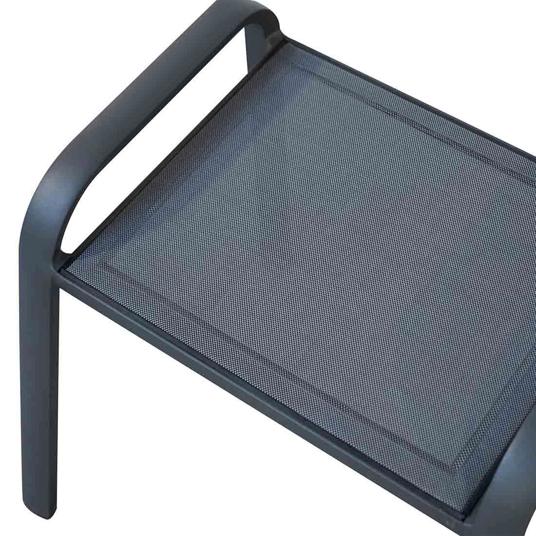 Das Gestell wird aus Aluminium gefertigt. Das geringe Eigengewicht des Materials macht den Gartenhocker zu einem robusten, aber dennoch leicht zu transportierenden Sitzmöbel auf Ihrer Terrasse. Für die Bespannung der Sitzfläche verlässt sich der Hersteller auf hochwertiges Textilene. Es zeichnet sich durch eine hohe Robustheit gegenüber Hitze und Frost aus und ist leicht zu reinigen. Für ein perfekt stimmiges Gesamtbild sorgt die einheitliche Farbgebung in stilvollem Grau.