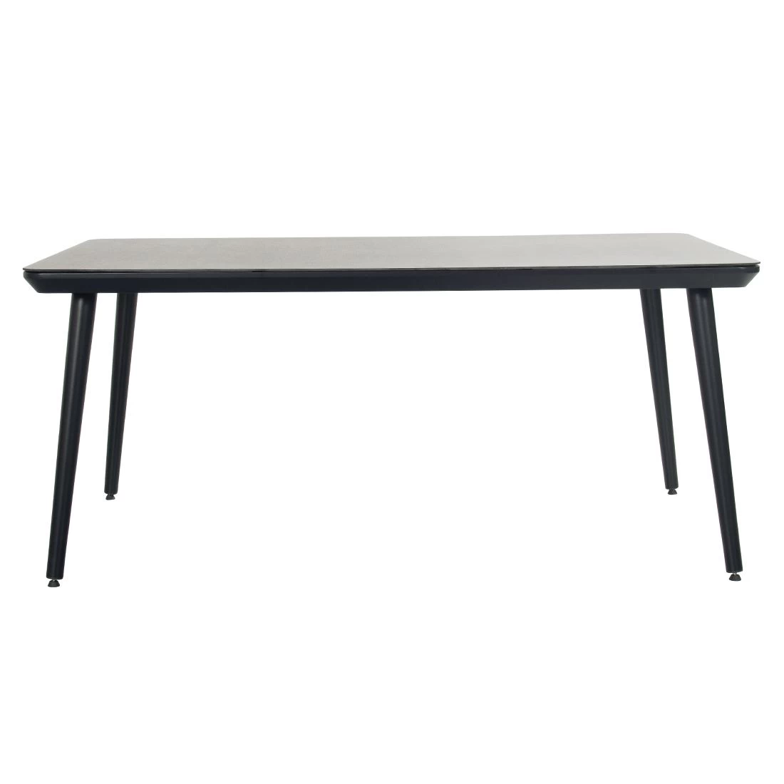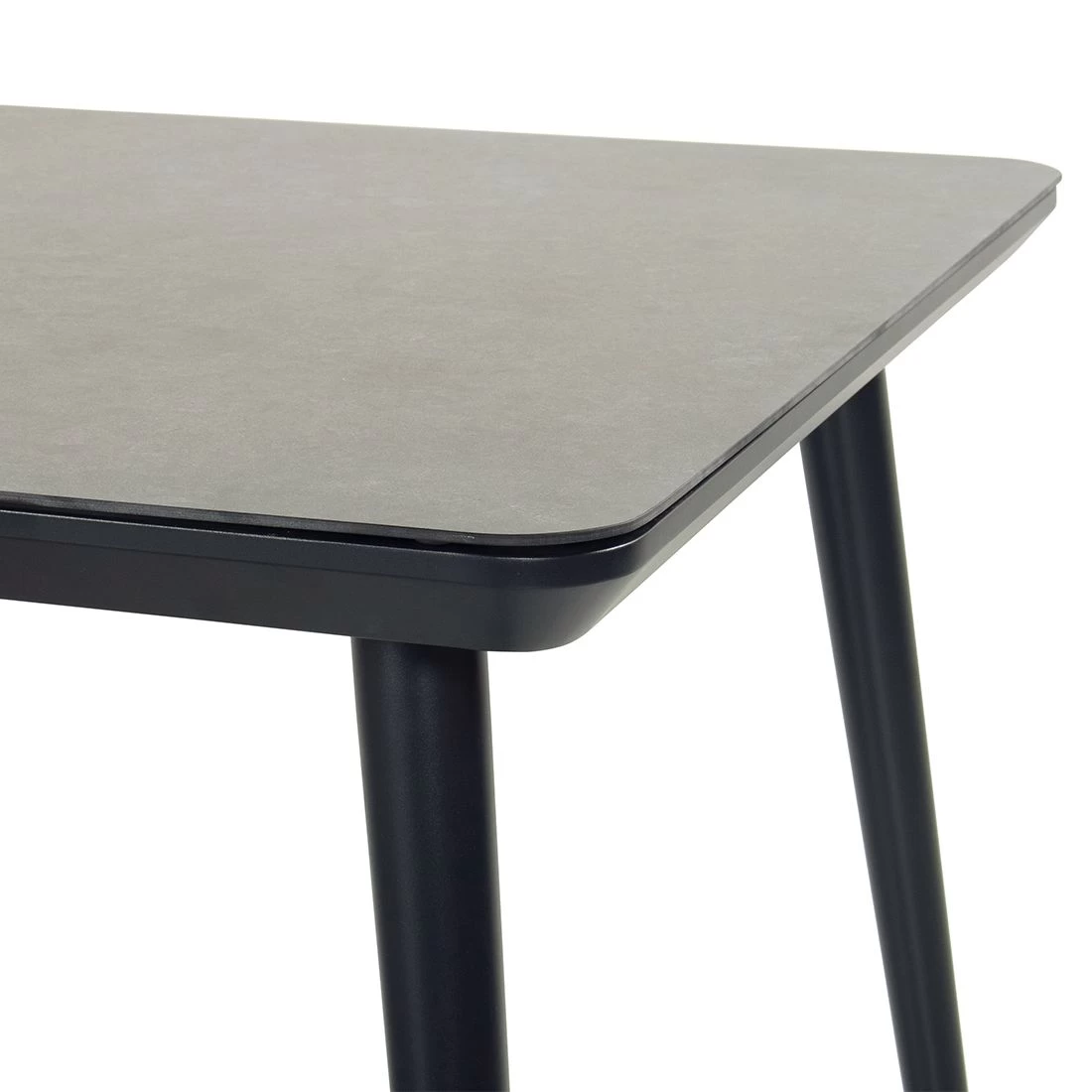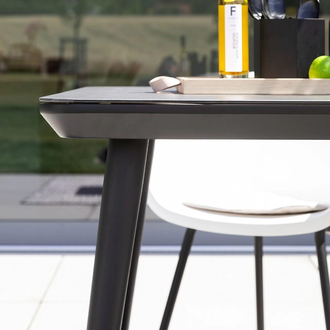 Das Gestell des attraktiven Tisches besteht aus Aluminium. Klassisch aus vier Tischbeinen besteht das Gestell des Tisches. Für die Tischplatte wird hochwertiges Keramik-Glas verarbeitet, welches auf der Terrasseeine angenehme Wohlfühl-Atmosphäre verbreitet. Farblich ist die Tischplatte in einem schönen Keramik Grau gehalten. Mit der rechteckigen Form lässt sich der Gartentisch platzsparend in Ecken oder an Häuserwänden aufstellen.