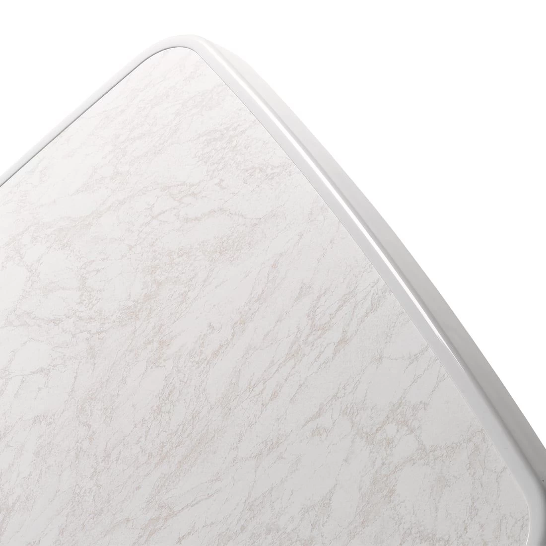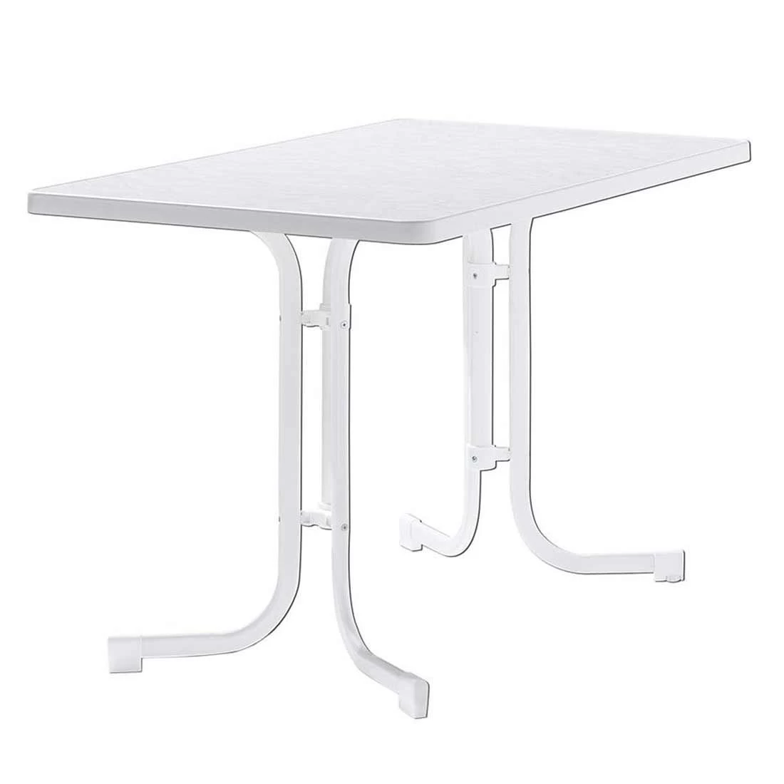 Das robuste Gestell-Material des Klapptisches besteht aus Stahl. Das Material, das für die Tischplatte verwendet wird, heißt „Mecalit“. Dabei handelt es sich um eine mit Melamin beschichtete Spanplatte. Durch die Beschichtung ist die Platte wetter- und kälte- sowie schlagfest und damit die perfekte Outdoor-Tischplatte. Farblich sind Gestell und Tischplatte einheitlich gestaltet und begeistern in Weiß. Als klassische Design-Komponente fungiert das geradlinige Vierfußgestell. Mit der rechteckigen Form lässt sich der Klapptisch platzsparend in Ecken oder an Häuserwänden aufstellen.