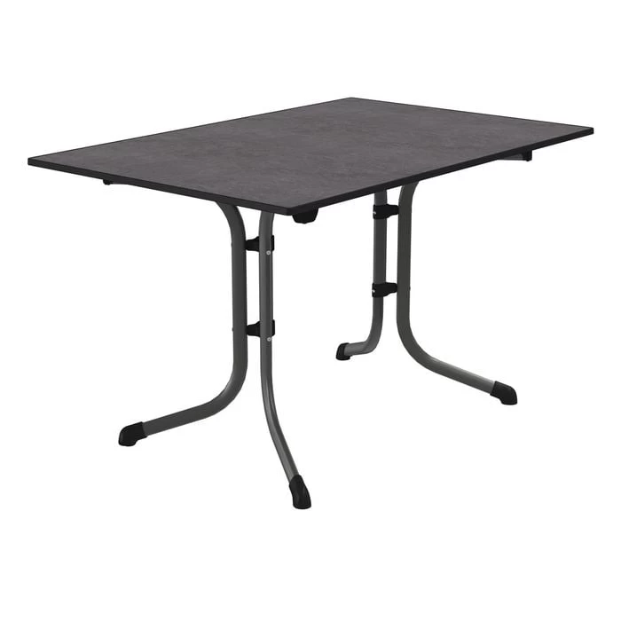Als stabiler Unterbau für die Tischplatte dient ein Gestell aus hochwertigem Stahl. Das klassische Vierfuß-Gestell garantiert Ihnen maximale Beinfreiheit. Für die Tischplatte wird das hochwertige Material „Vivodur“ aus dem Hause Sieger verwendet. Die Beschichtung aus Melamin macht die Platte wetter-, kälte-, und schlagfest und somit zum perfekten Begleiter für Draußen. Für ein elegantes Gesamtbild erscheint die Platte in der Farbe Schiefer Anthrazit. Die rechteckige Form ermöglicht es Ihnen, den Klapptisch in Ecken und an Häuserwänden platzsparend einzusetzen.