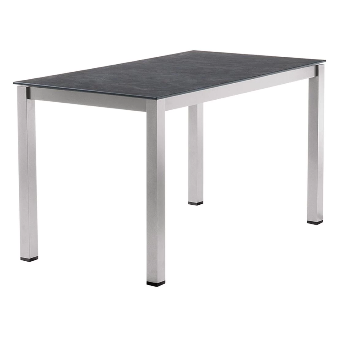 Mit seinem Gestell-Material Aluminium zählt der Gartentisch zu den modernen Tischmodellen, die sich auf der Terrasse problemlos aufstellen und bewegen lassen. Farblich ist das Gestell in Graphit gehalten. Die Tischplatte ist aus Polytec gefertigt. Es handelt sich dabei um eine besonders robuste HPL-Platte, die durch ihre Materialeigenschaften bestens für den Einsatz im Freien geeignet ist. Die Platte ist wetter-, kälte-, schlag- und kratzfest und zudem auch noch pflegeleicht. Für ein stimmiges Gesamtbild erscheint die Platte in der Farbe Schiefer. Mit der rechteckigen Form lässt sich der Gartentisch platzsparend in Ecken oder an Häuserwänden aufstellen.