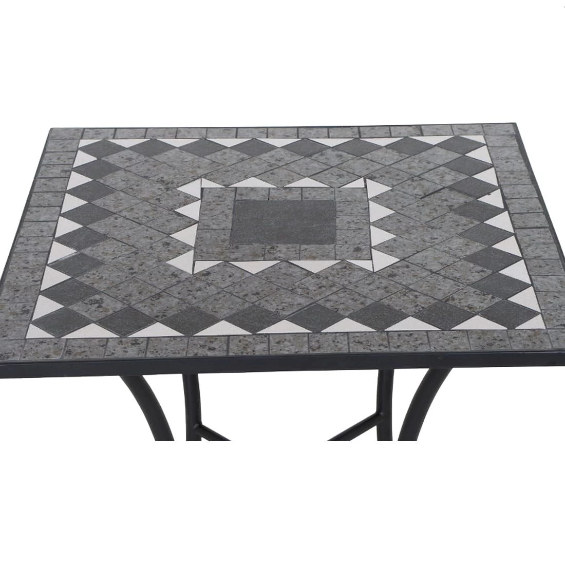 Als Gestellmaterial wird robuster Stahl verwendet. Dass ein Möbelstück auch ein Hingucker sein kann, beweist dieses Modell mit seinem außergewöhnlichen Gestell in X-Form. Für die Tischplatte wird hochwertiges Keramik verarbeitet, das auf der Terrasse und im Garten eine angenehme Wohlfühl-Atmosphäre fördert. Für ein stimmiges Gesamtbild erscheint die Platte in der Farbe Mosaik. Mit der kompakten quadratischen Form sorgt der Gartentisch auch auf beengtem Raum für Gemütlichkeit.