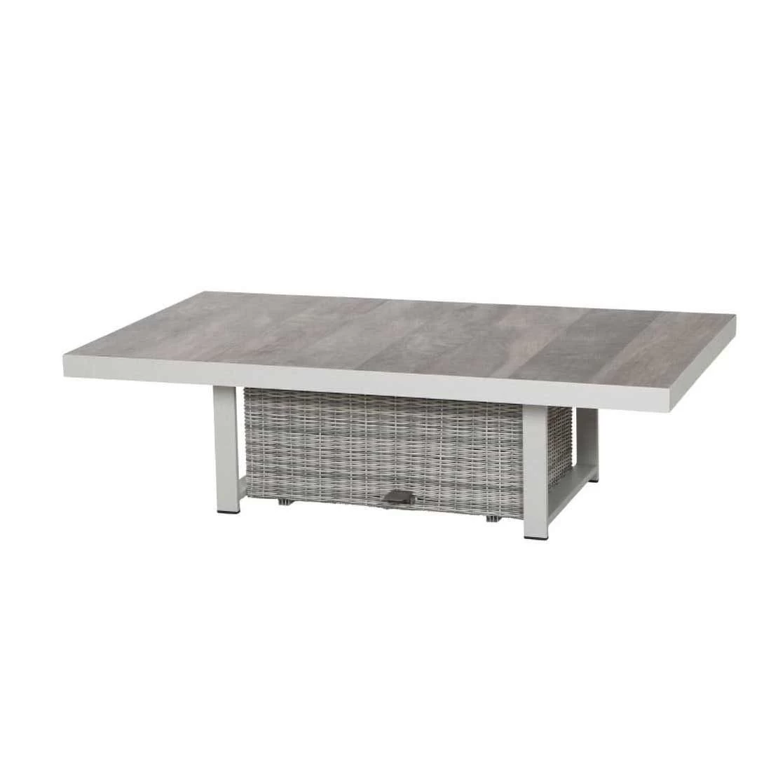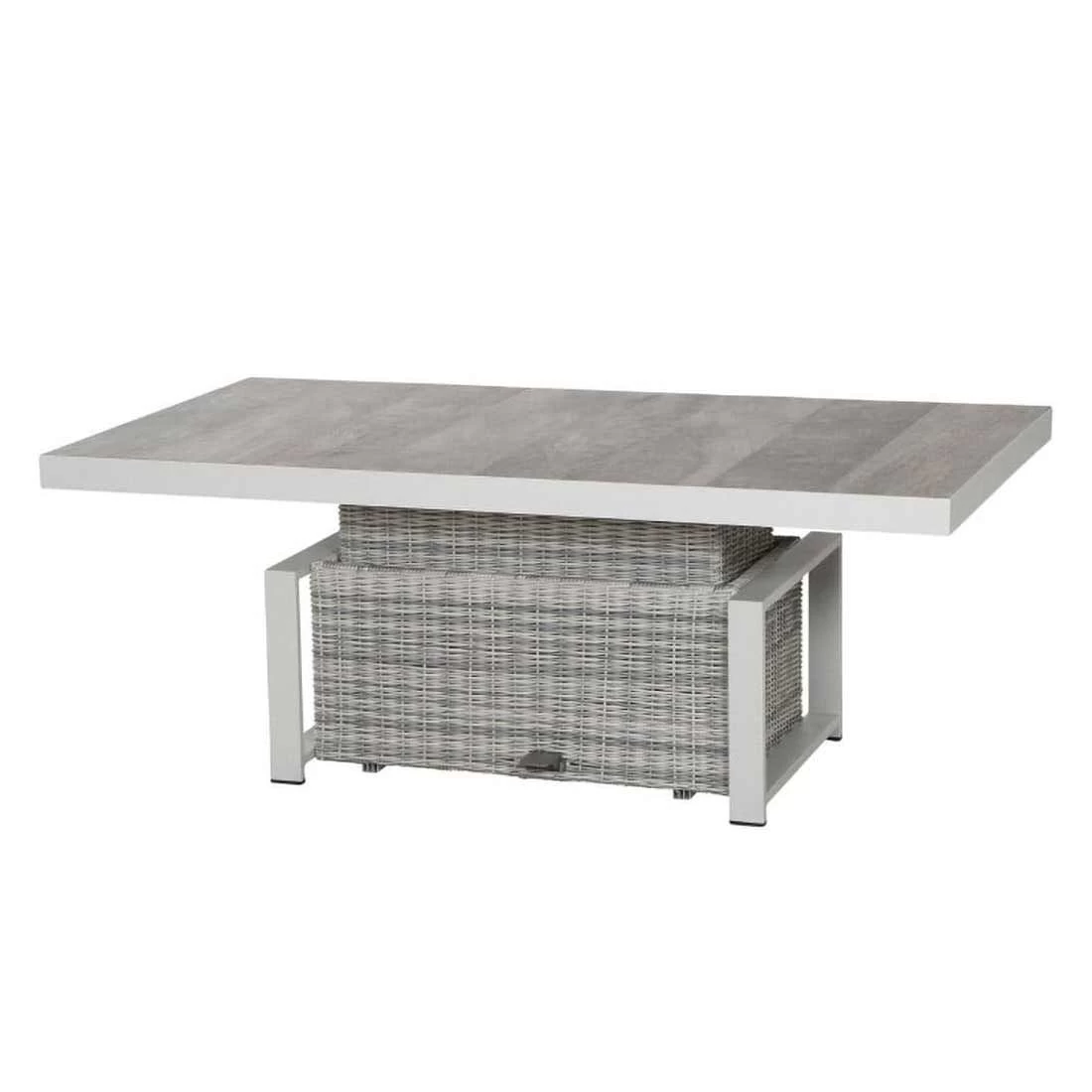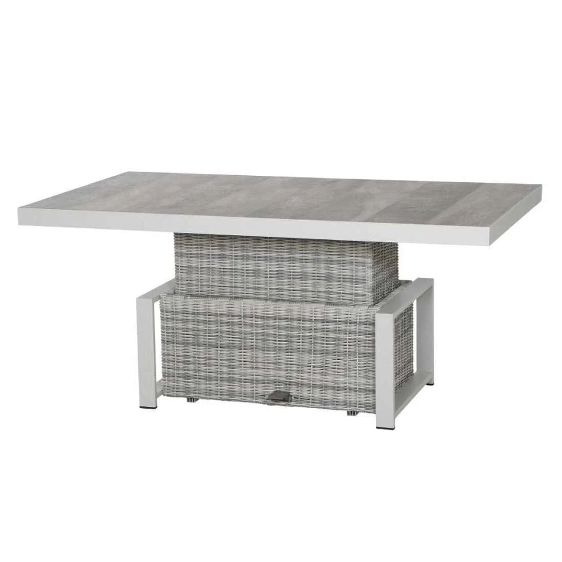 Das Gestell des attraktiven Tisches ist aus Aluminium gefertigt. Optisch ist das Gestell in Weiß-Grau matt gehalten. Für die Tischplatte wird hochwertiges Keramik verarbeitet, das auf der Terrasse und im Garten eine angenehme Wohlfühl-Atmosphäre schafft. Farblich ist die Platte in Keramik washed gehalten. Ein stabiler Unterbau und dabei gleichzeitig dekorativ ist das Säulengestell. Der Gartentisch ist klassisch rechteckig gestaltet.
