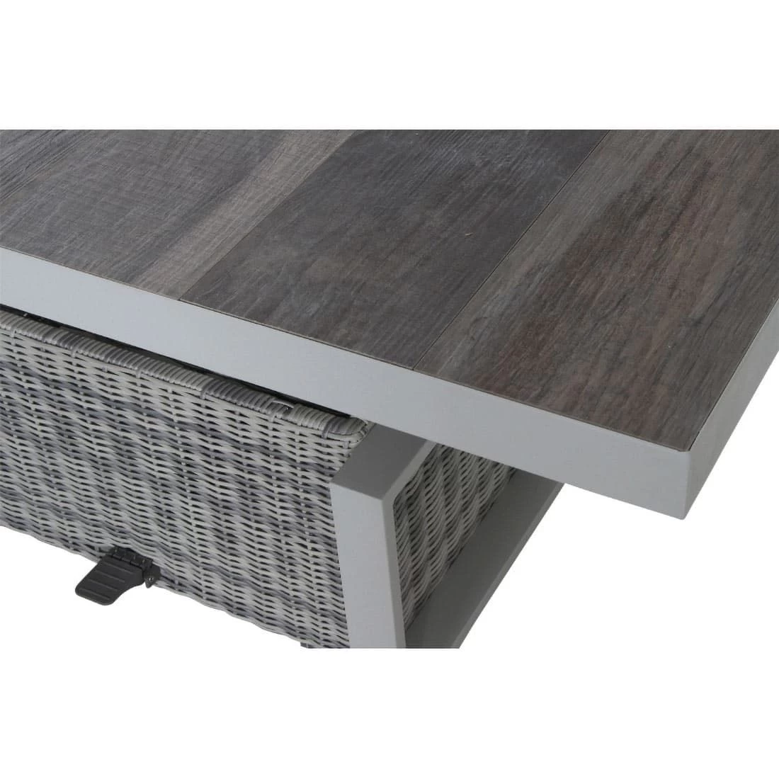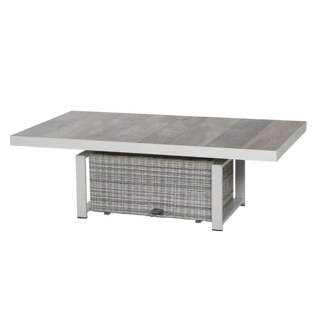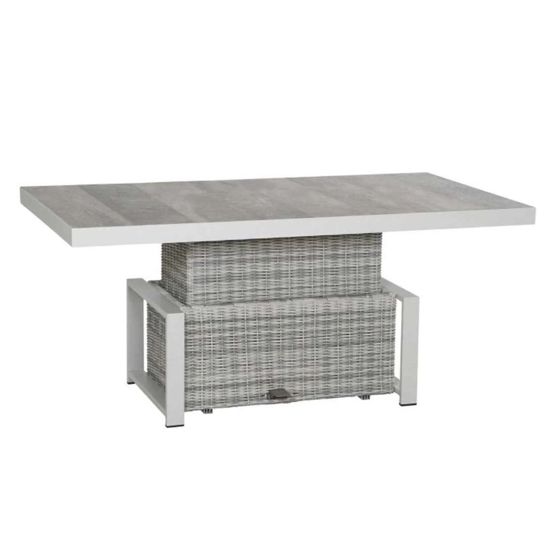 Das Gestell des attraktiven Tisches ist aus Aluminium gefertigt. Optisch ist das Gestell in Weiß-Grau matt gehalten. Für die Tischplatte wird hochwertiges Keramik verarbeitet, das auf der Terrasse und im Garten eine angenehme Wohlfühl-Atmosphäre schafft. Farblich ist die Platte in Keramik washed gehalten. Ein stabiler Unterbau und dabei gleichzeitig dekorativ ist das Säulengestell. Der Gartentisch ist klassisch rechteckig gestaltet.