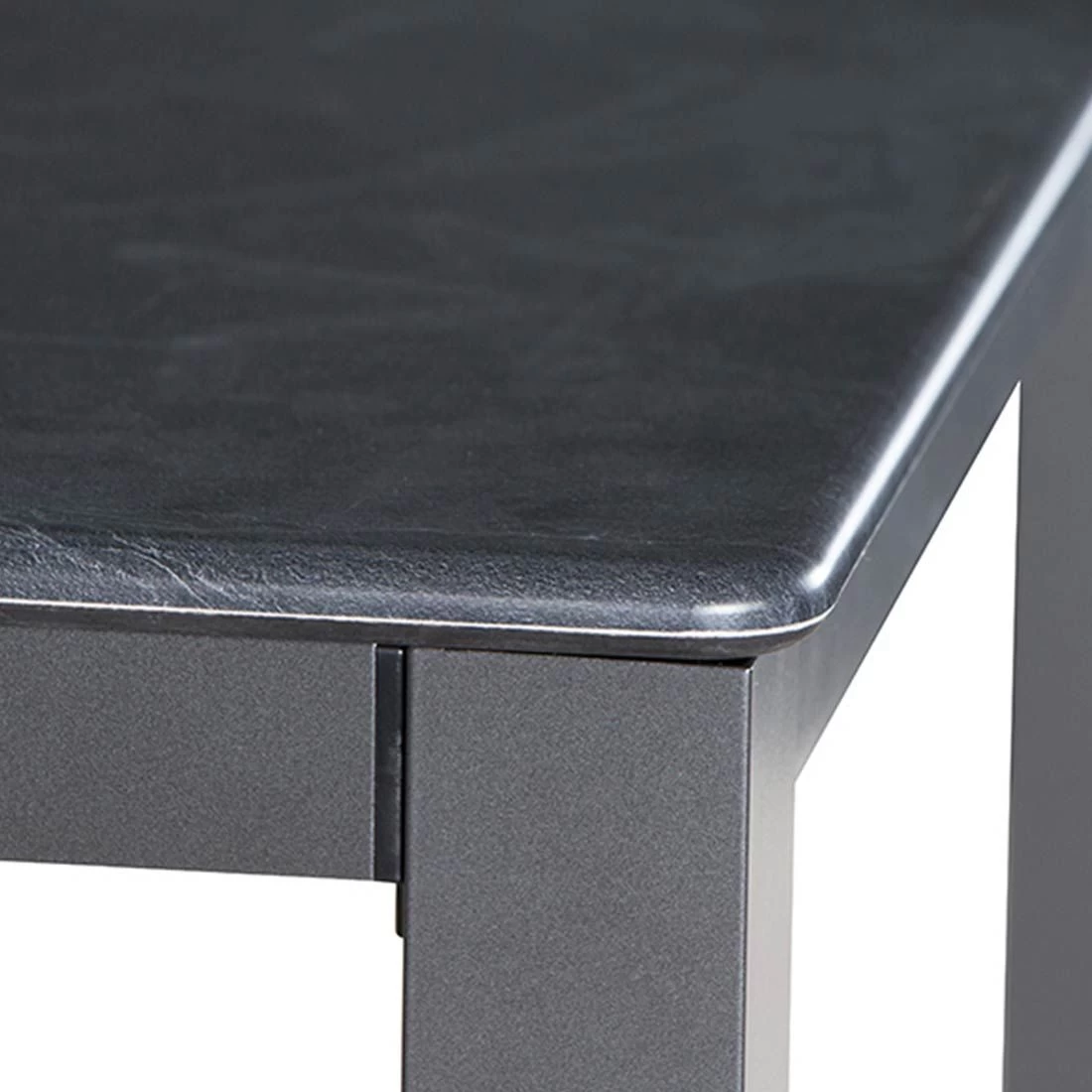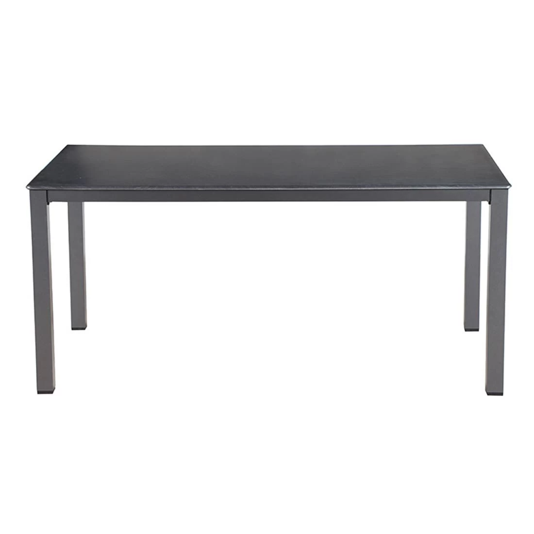 Seine Stabilität erhält der Tisch durch das robuste Tischgestell aus Stahl. Als klassische Design-Komponente fungiert das geradlinige Vierfußgestell. Das Material, das für die Tischplatte verwendet wird, heißt Topalit. Dabei handelt es sich um eine formgepresste Platte, die über eine fugenlose Oberfläche verfügt. Im Detail wird dafür nur ausgesuchtes Faserholz verwendet, das mit hochwertigen Kunstharzen zu einer formbaren Pressmasse zusammengefügt wird. Der Vorteil: Topalit-Tischplatten bieten einen optimalen Schutz gegenüber Witterungseinflüssen und sind wetterfest. Farblich ist die Platte in Schiefer gehalten. Die rechteckige Form ermöglicht es Ihnen, den Gartentisch in Ecken und an Häuserwänden platzsparend einzusetzen.