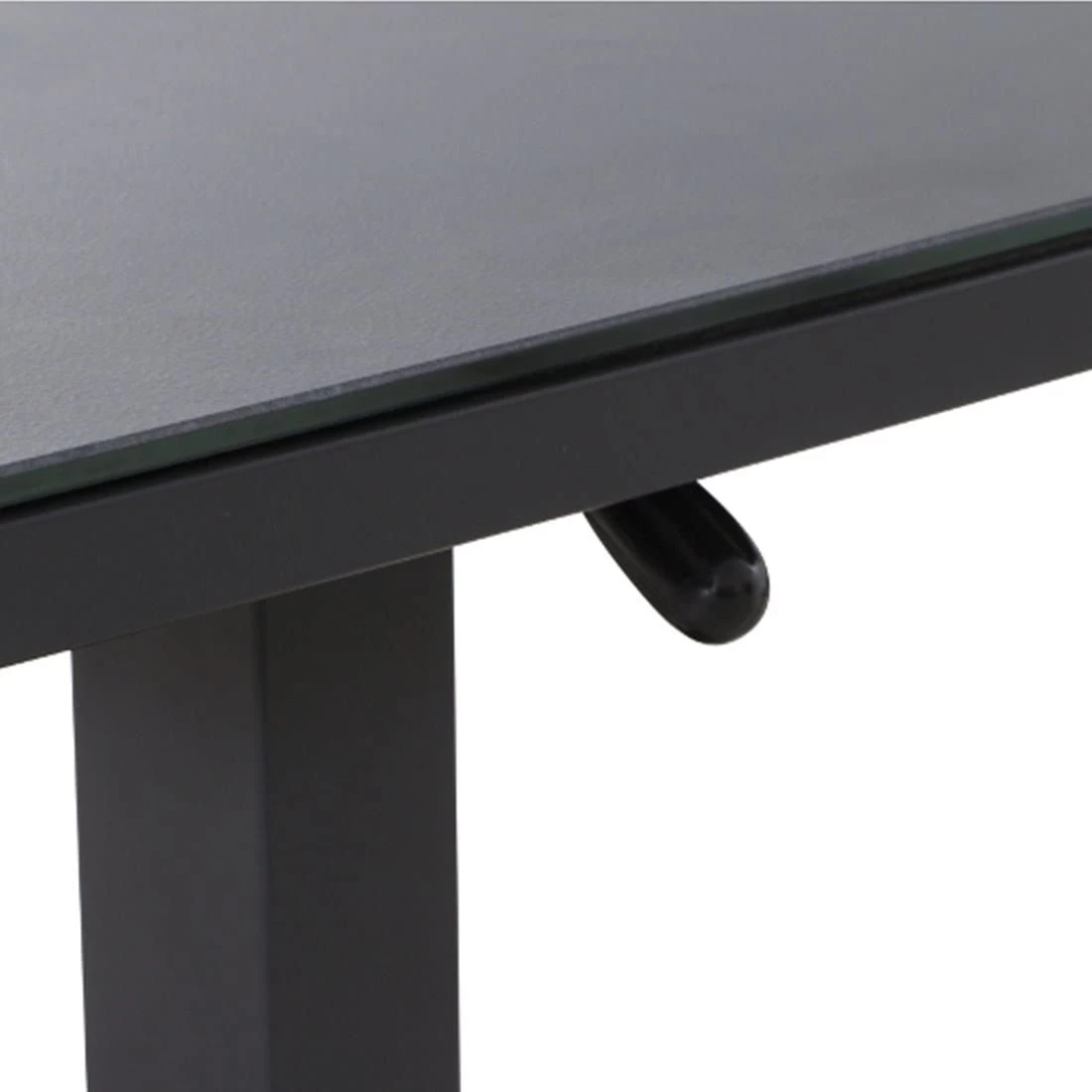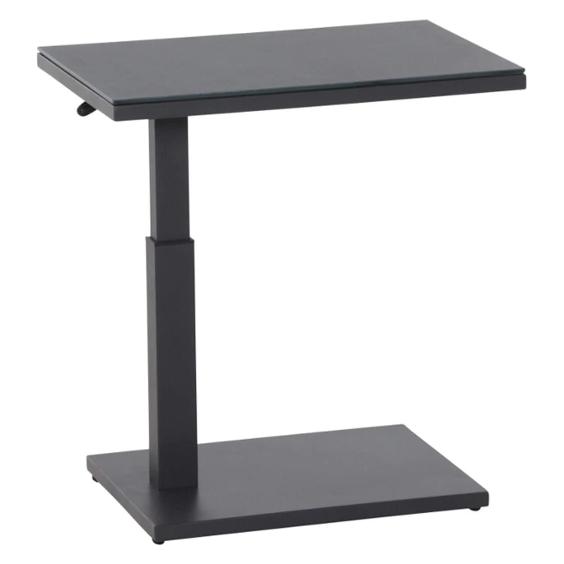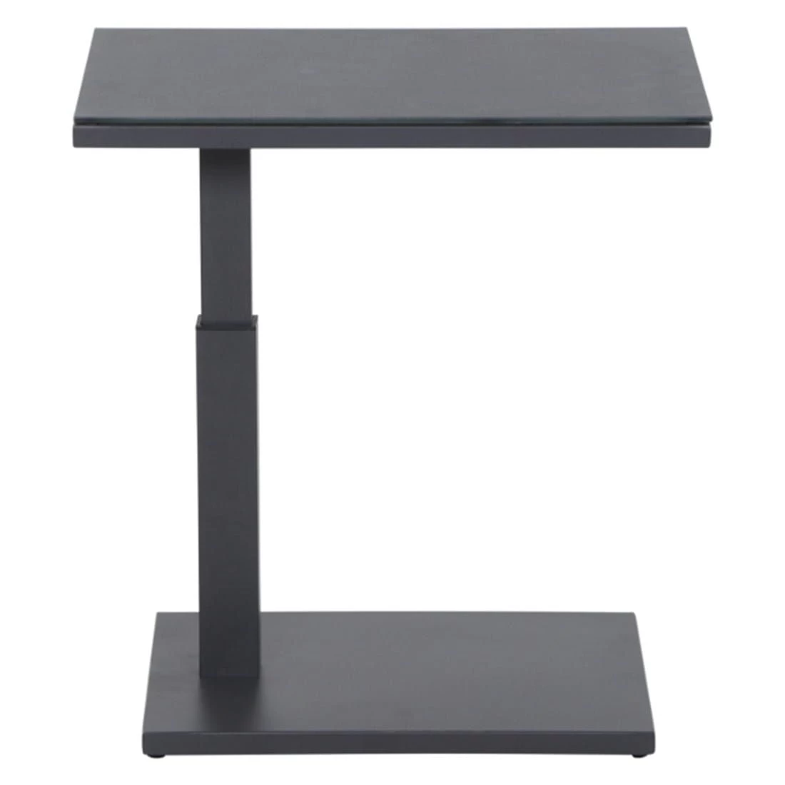 Das Gestell des eleganten Tisches besteht aus Aluminium. Optisch ist das Gestell in Anthrazit gehalten. Für die Herstellung der Tischplatte wird robustes Glas verwendet. Farblich ist die Tischplatte in einem schönen Dunkelgrau gehalten. Das Design des Beistelltischs ist klassisch rechteckig gehalten.