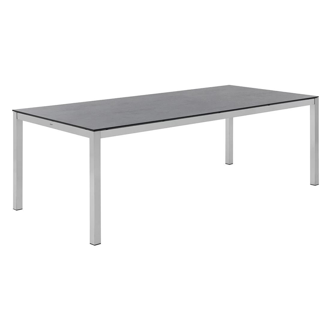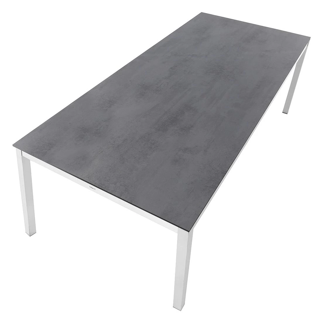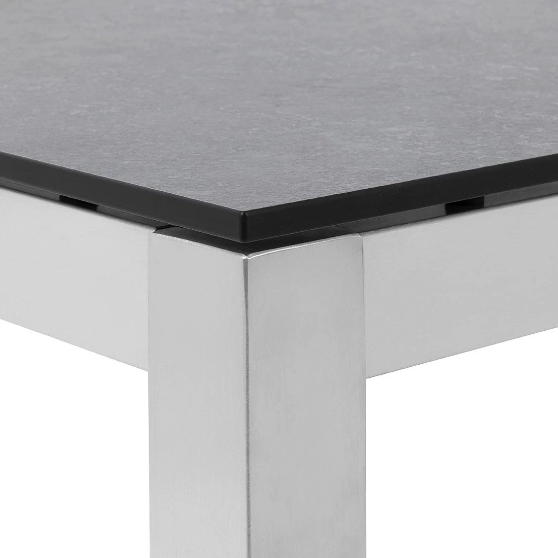 Das Gestell ist aus rostfreiem und pflegeleichtem Edelstahl gefertigt und besonders windsicher auf der Terrasse. Farblich ist das Gestell in Silber gehalten. Die formschöne HPL-Tischplatte ist nicht nur ein optischer Hingucker, sondern besitzt zudem auch eine sehr widerstandsfähige und unbedingt kratzfeste Oberfläche, die sämtlichen Belastungen trotzt. Farblich ist die Platte in Volcano Grey gehalten. Als klassische Design-Komponente fungiert das geradlinige Vierfußgestell. Das Design des Gartentisches ist klassisch rechteckig gehalten.