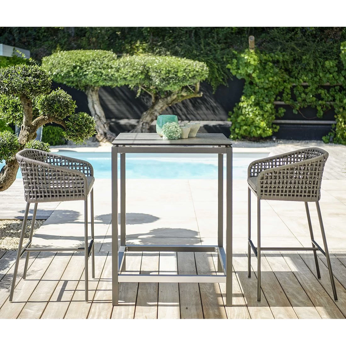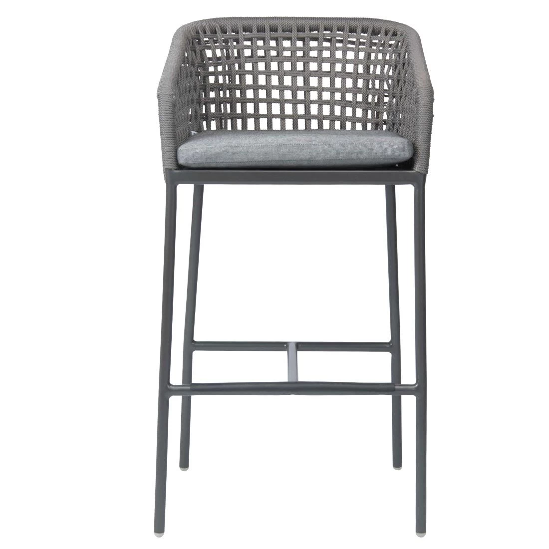 Für die Herstellung des Gestells wird hochwertiges und wetterfestes Aluminium verwendet. Für eine attraktive Optik ist das Gestell im Farbton Anthrazit gehalten. Hochwertiges Rope umgibt das robuste Gestell und verleiht Garten-Barstuhl damit einen ganz besonderen Look. Als hochwertiges Material für die Bezüge kommt ein Polyacryl-Stoff zum Einsatz. Er ist sehr strapazierfähig und bietet somit die idealen Voraussetzungen für den Einsatz im Freien. Damit Garten-Barstuhl optisch ansprechend ist, sind die Sitzfläche und der Bezug im Farbton Seidengrau gehalten.