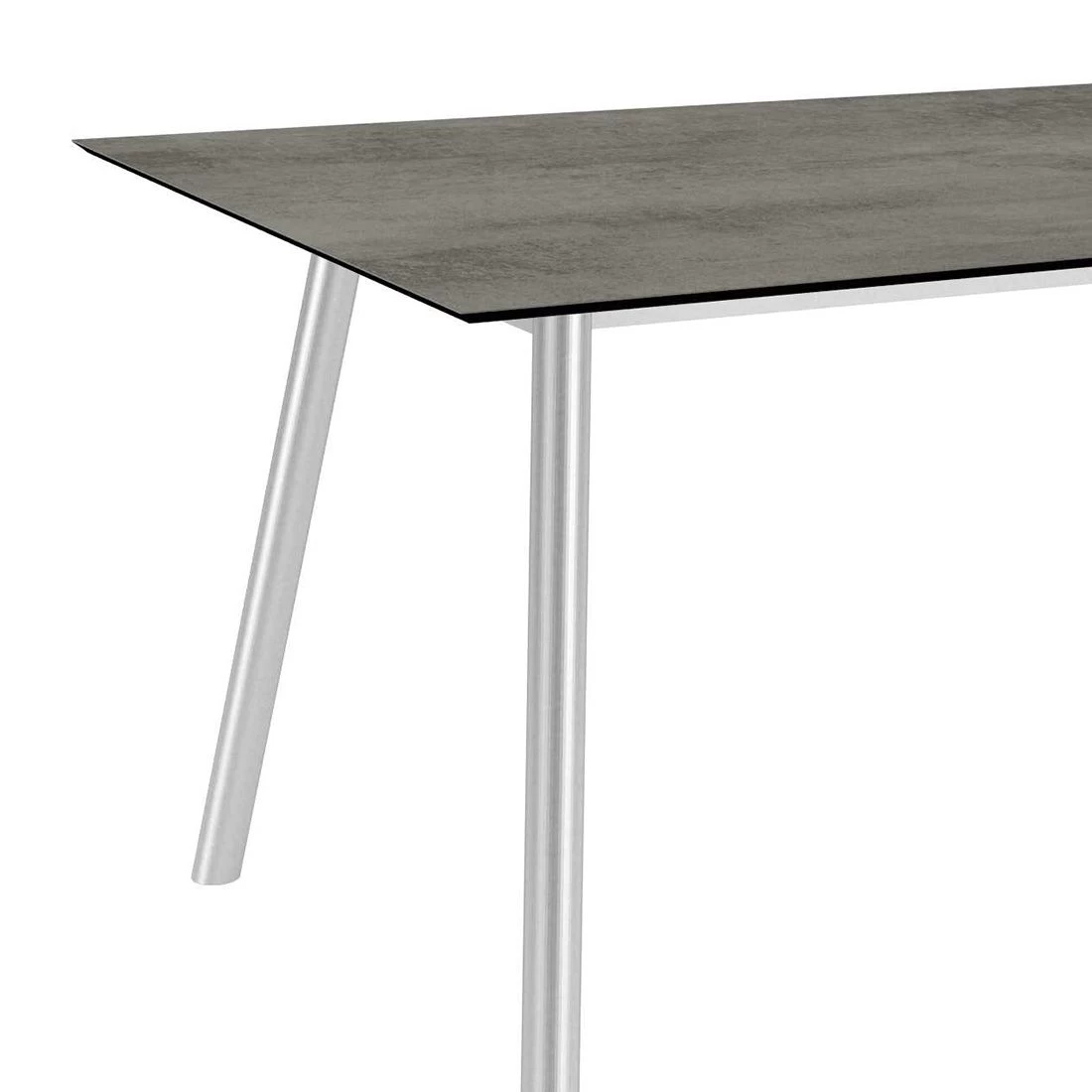 Das Gestell ist aus rostfreiem und pflegeleichtem Edelstahl gefertigt und äußerst windsicher auf der Terrasse und im Garten. Das klassische Vierfuß-Gestell garantiert Ihnen maximale Beinfreiheit. Farblich ist die Platte in Zement gehalten. Der Gartentisch ist klassisch rechteckig gestaltet.