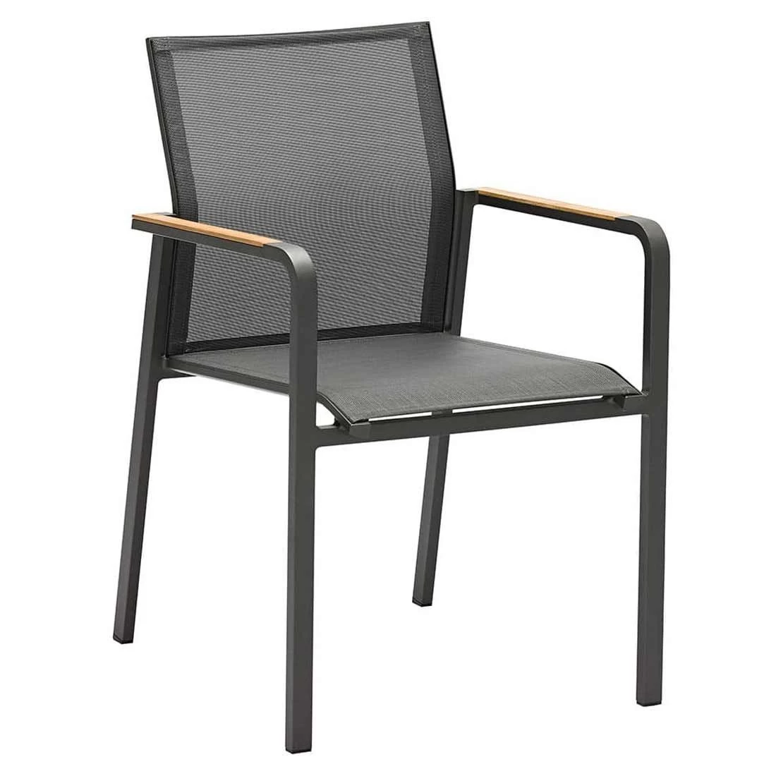 Das Gestell besteht aus pflegeleichtem und wetterfestem Aluminium. Für eine attraktive Optik ist das Gestell im Farbton Graphit gehalten. Für die Bespannung der Sitzfläche verlässt sich der Hersteller auf hochwertiges Textilene. Es zeichnet sich durch eine hohe Robustheit gegenüber Hitze und Frost aus und ist leicht zu reinigen. Die Sitzfläche ist in ansprechendem Carbon Grey gehalten. Farblich begeistert der Bezug in elegantem Carbon Grau.