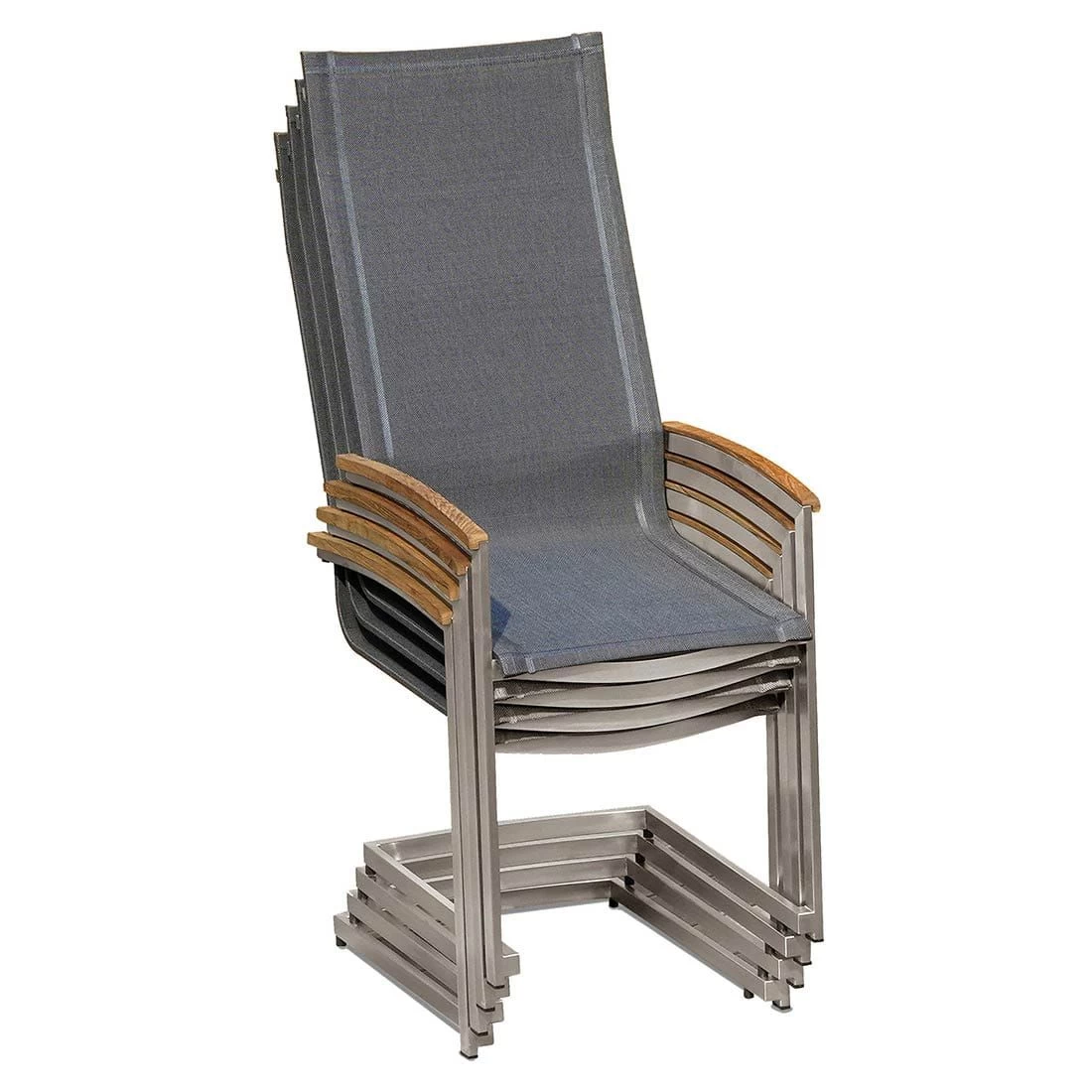 Für die Bespannung der Sitzfläche wird ein besonders hochwertiges Textilene, das sogenannte Batyline, gewählt. Es zeichnet sich durch besonders hohe Robustheit gegenüber Hitze und Frost aus und ist leicht zu reinigen. Der Freischwinger ist bis zu einem Gewicht von 100 kg belastbar. Angenehm ist auch die Sitzhöhe, welche bei 46 cm liegt.